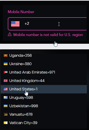 When attempting to create a new profile, I try adding a mobile number for the US. It should be +1. It is displaying +2. I am unable change it.